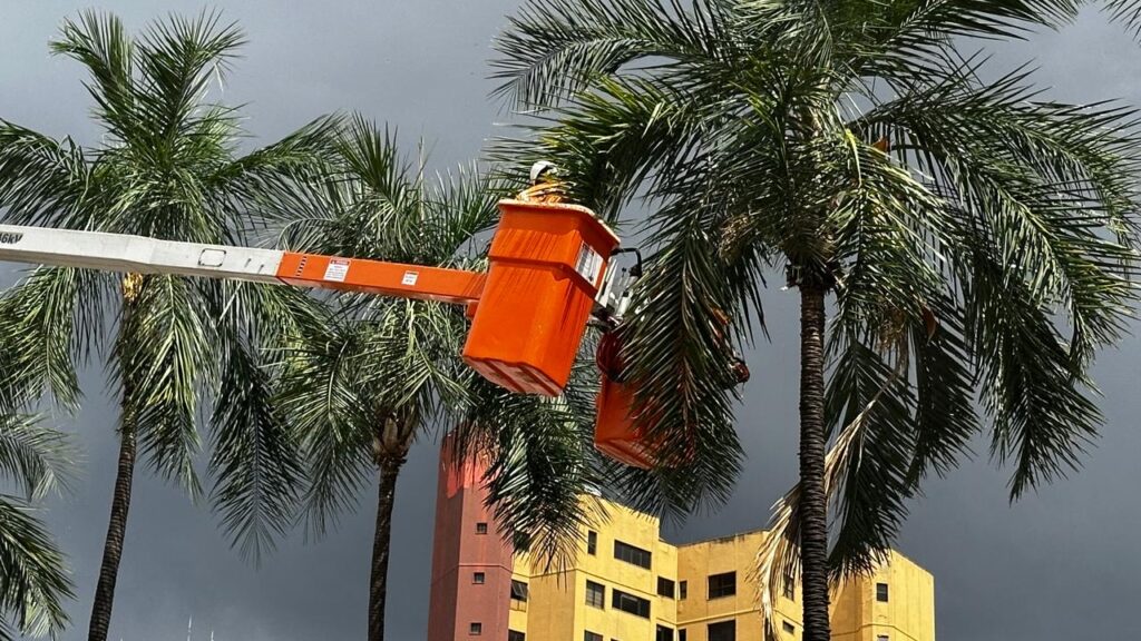 Nas palmeiras, o tronco e o topo são limpos, enquanto nas guarirobas (presentes na Av. T-7 e T-63), a poda se concentra na limpeza da copa para melhorar o fluxo de ar e luz, além de eliminar ramos que possam interferir na fiação elétrica ou dificultar a passagem.